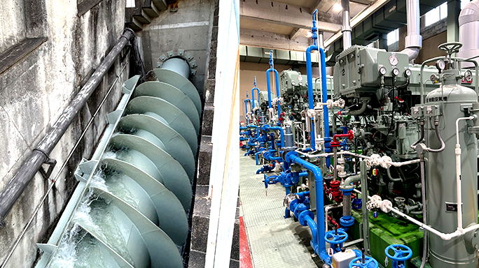 大雨が降って市役所周辺や能勢口周辺から南側が浸水しないようにポンプ場が整備されています。